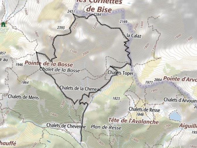 | Chalets rencontrés : Chalet de la Bosse (ruines), Chalets de la Calaz, Chalets de la Cheneau, Chalets de Toper. | Lieux-dits traversés: Plan Berger, Couloir du Séraukin. |