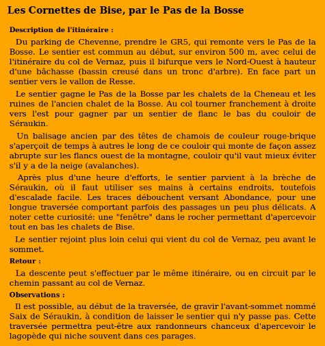 | Sommet(s) franchi(s) : Saix Rouquin, Cornettes de Bise. | Col(s) franchi(s) : Pas de la Bosse, Col des Cornettes, Col de Vernaz. |