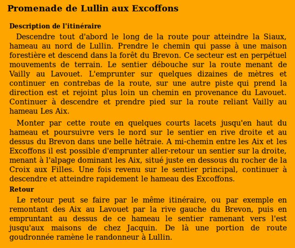 | Chalets rencontrés : Aucun. | Lieux-dits traversés: Les Aix, Les Excoffons, Chez Jacquin, Le Lavouet, La Siaux. |