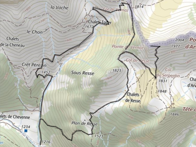| Chalets rencontrés : Chalet de Resse, Chalets de Toper. | Lieux-dits traversés: Plan de Resse. |