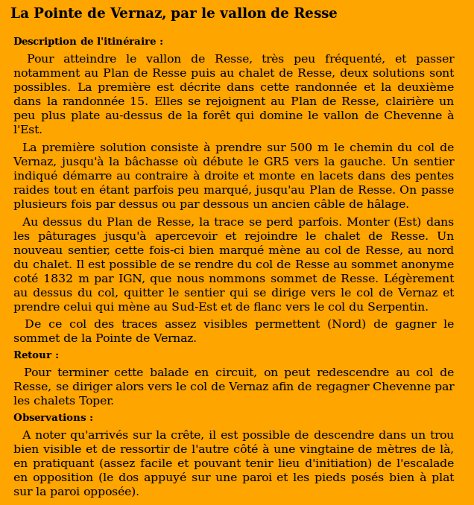 | Sommet(s) franchi(s) : Pointe de Vernaz, Sommet de Resse. | Col(s) franchi(s) : Col de Resse, Col du Serpentin, Col de Vernaz. |