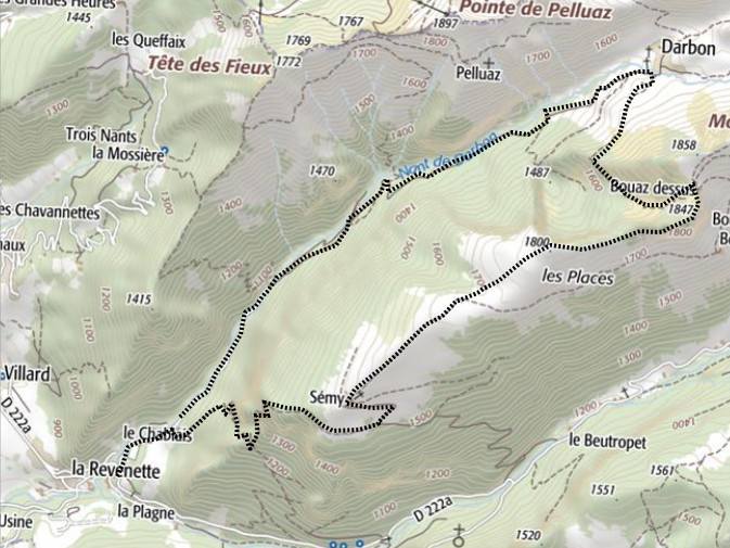 | Chalets rencontrés : Chalet le Bouaz d'en Haut, Le Chablais, Chalets de Darbon, Chalets de Semy. | Lieux-dits traversés: Aucun. |