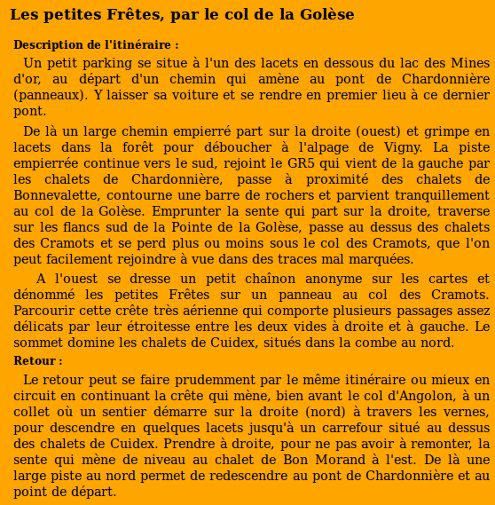| Sommet(s) franchi(s) : Les petites Frêtes. | Col(s) franchi(s) : Col des Cramots, Col de la Golèse. |