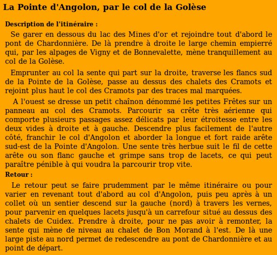 | Sommet(s) franchi(s) : Pointe d'Angolon, Les petites Frêtes. | Col(s) franchi(s) : Col d'Angolon, Col des Cramots, Col de la Golèse. |