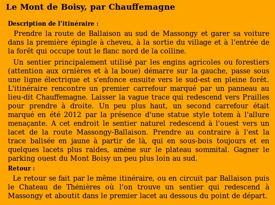 | Photo de l'itinéraire Carte de l'itinéraire | Description de l'itinéraire |