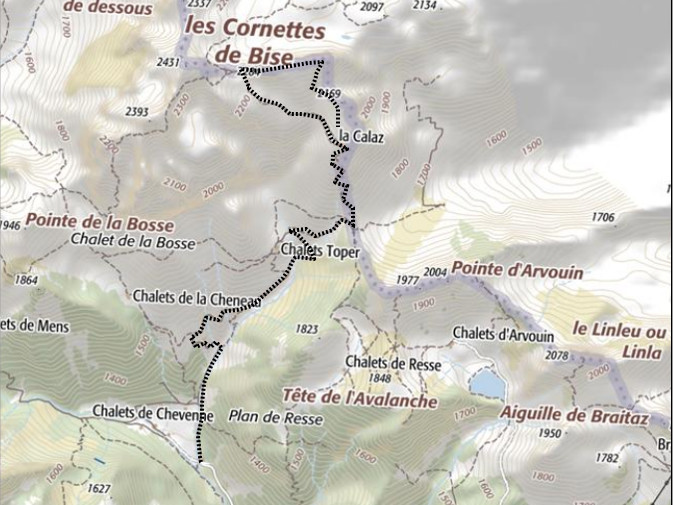 | Chalets rencontrés : Chalets de la Calaz, Chalets de Toper. | Lieux-dits traversés: Plan Berger. |