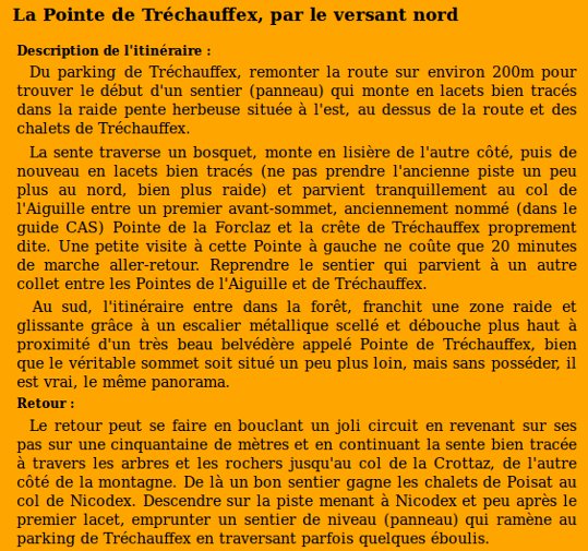 | Sommet(s) franchi(s) : Pointe de Tréchauffex, Pointe de la Forclaz (Sangeon). | Col(s) franchi(s) : Col de l'Aiguille, Col de la Crottaz, Col de Nicodex. |