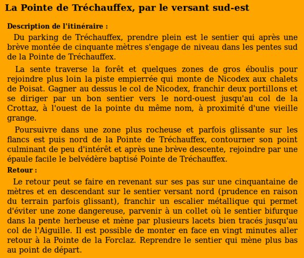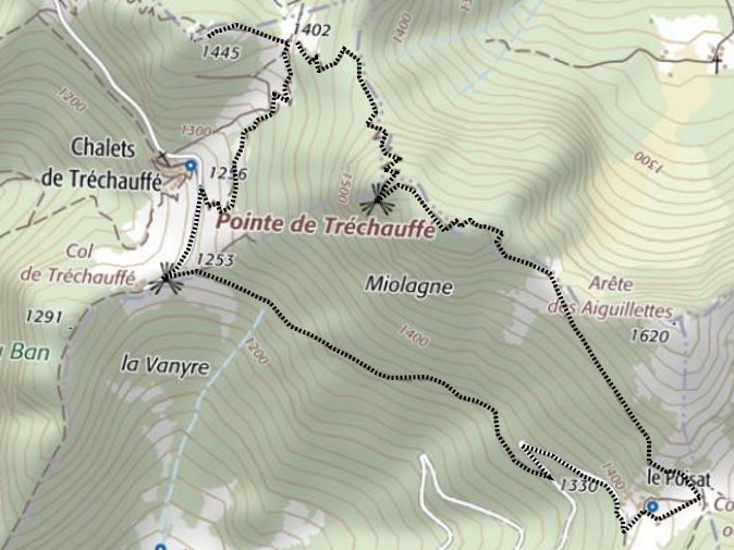 Sommet(s) franchi(s) : Pointe de Tréchauffex, Pointe de la Forclaz (Sangeon). Col(s) franchi(s) : Col de l'Aiguille, Col de la Crottaz, Col de Nicodex.