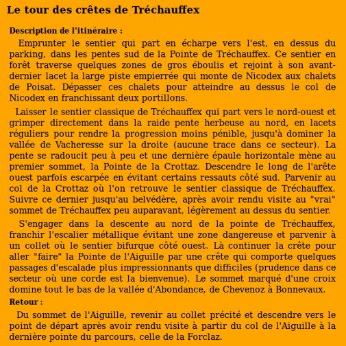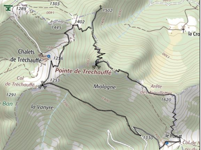 | Sommet(s) franchi(s) : Pointe de l'Aiguille (Tréchauffex), Pointe de la Crottaz, Pointe de la Forclaz (Sangeon), Pointe de Tréchauffex. | Col(s) franchi(s) : Col de l'Aiguille, Col de la Crottaz, Col de Nicodex. |
