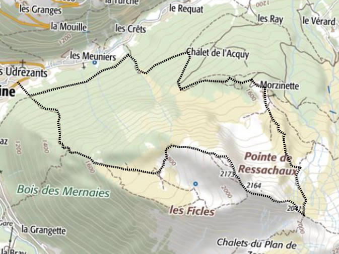 | Chalets rencontrés : Chalet de l'Acquy, L'Apliot, Le Creux de Ressachaux, Chalets de Morzinette. | Lieux-dits traversés: Aucun. |