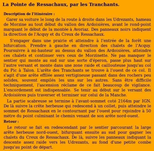| Sommet(s) franchi(s) : Pointe de Ressachaux, Les Tranchants. | Col(s) franchi(s) : Col du Pic à Talon. |