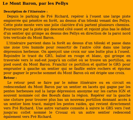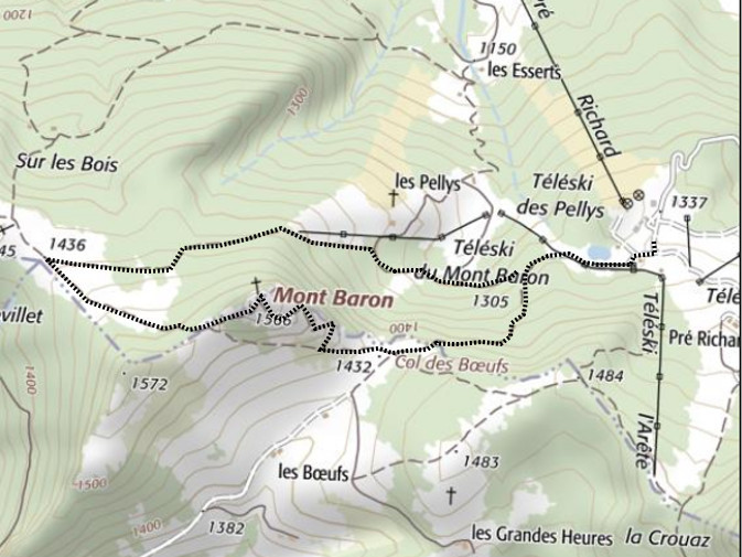 | Sommet(s) franchi(s) : Mont Baron. | Col(s) franchi(s) : col des Boeufs. |