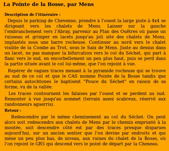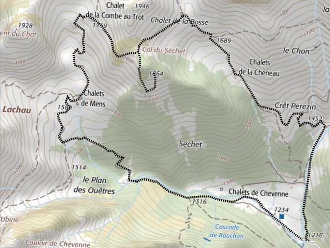| Chalets rencontrés : Chalet de la Bosse (ruines), Chalets de la Cheneau, Chalet de la Combe au Trot, Chalets de Mens. | Lieux-dits traversés: Le Plan des Ouêtres. |