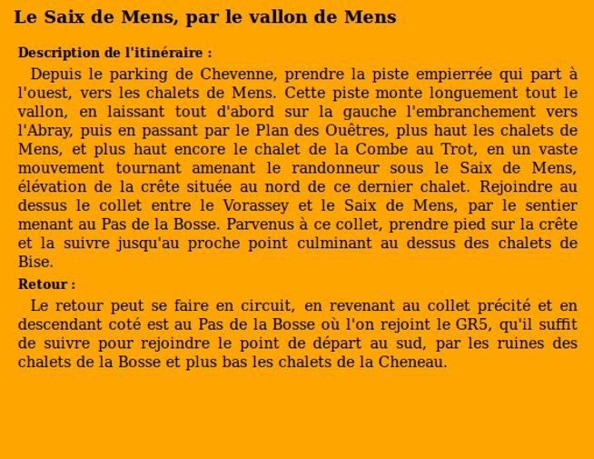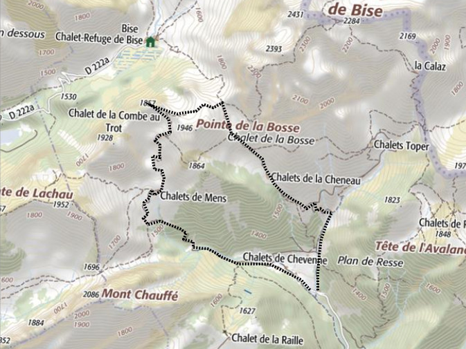 | Chalets rencontrés : Chalet de la Bosse (ruines), Chalets de la Cheneau, Chalet de la Combe au Trot, Chalets de Mens. | Lieux-dits traversés: Aucun. |