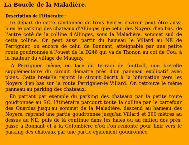 | Sommet(s) franchi(s) : La Maladière. | Col(s) franchi(s) : Aucun. |