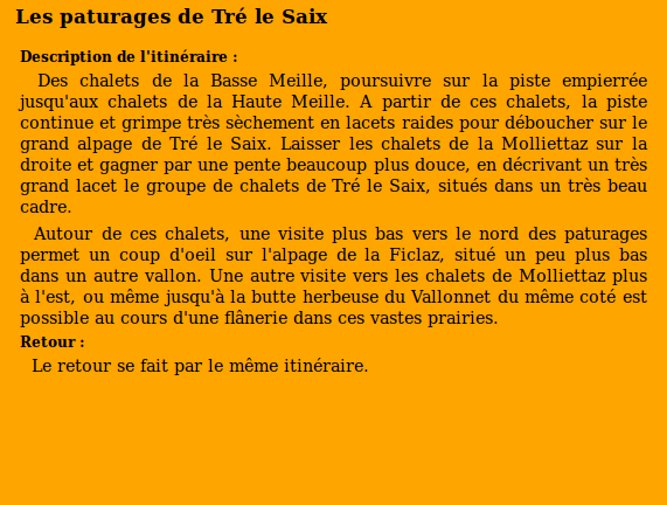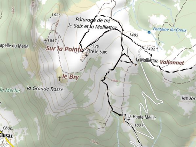 | Chalets rencontrés : Chalets de la Haute Meille, Chalets de la Molliettaz, Chalets de Tré le Saix. | Lieux-dits traversés: Aucun. |