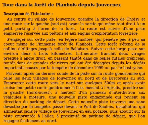 | Photo de l'itinéraire Carte de l'itinéraire | Description de l'itinéraire |