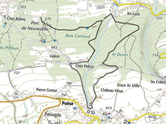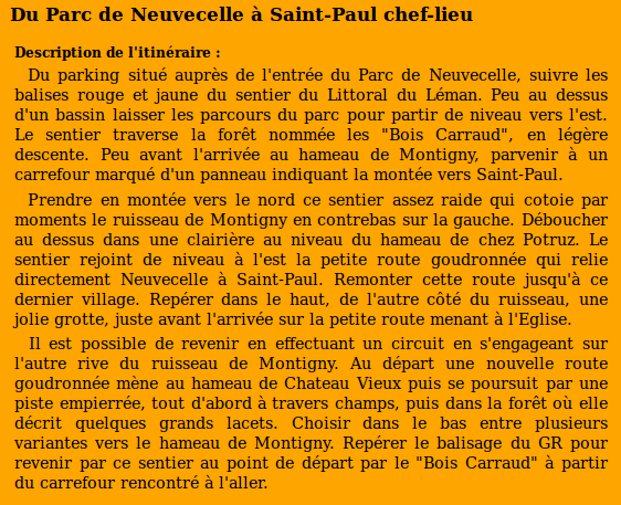 | Chalets rencontrés : Aucun. | Lieux-dits traversés: Parc de Neuvecelle, Chez Potruz, Saint-Paul en Chablais, Montigny, Bois Carraud, Château vieux. |