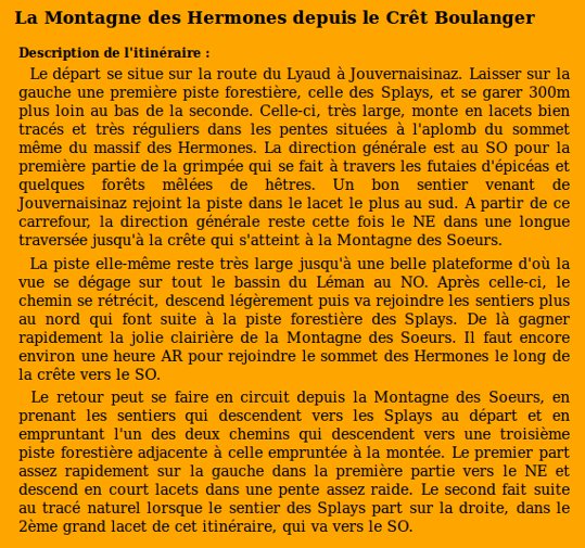 | Photo de l'itinéraire Carte de l'itinéraire | Description de l'itinéraire |