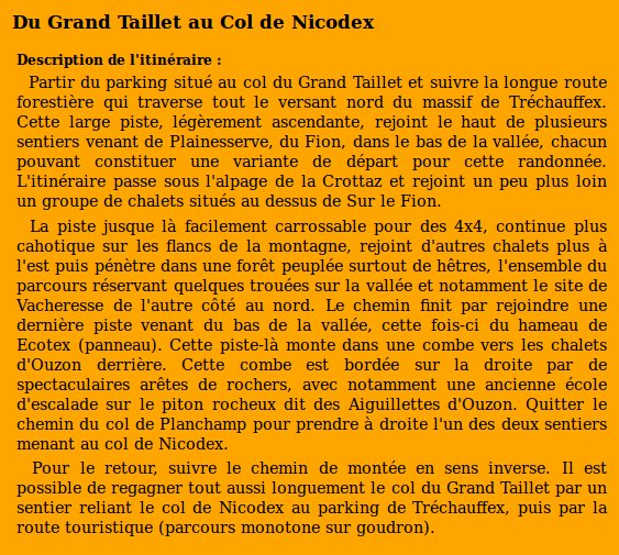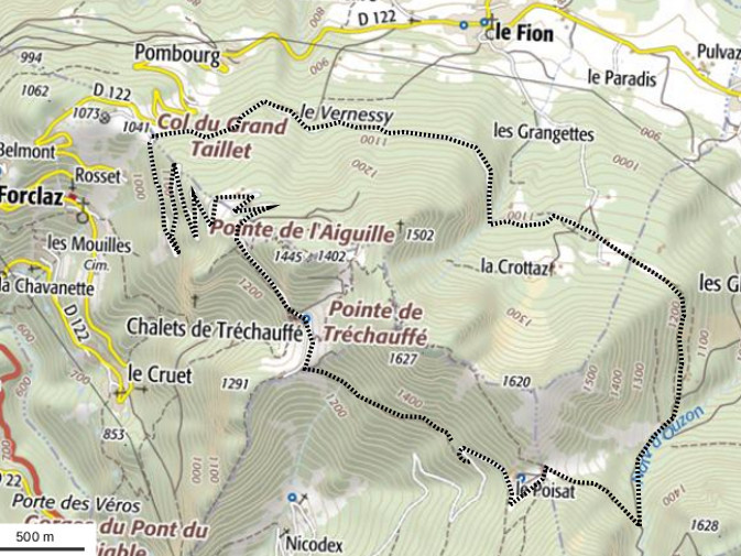 | Sommet(s) franchi(s) : Aucun. | Col(s) franchi(s) : col du Grand Taillet, Col de Nicodex. |