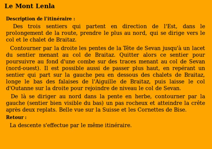 | Photo de l'itinéraire Carte de l'itinéraire | Description de l'itinéraire |