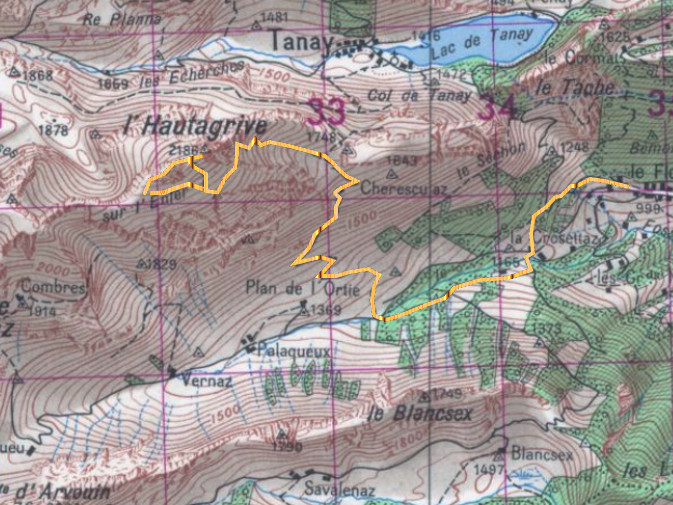 | Point de départ: Le Flon, hameau au bout d'une route au dessus et à l'ouest de Vouvry  | |