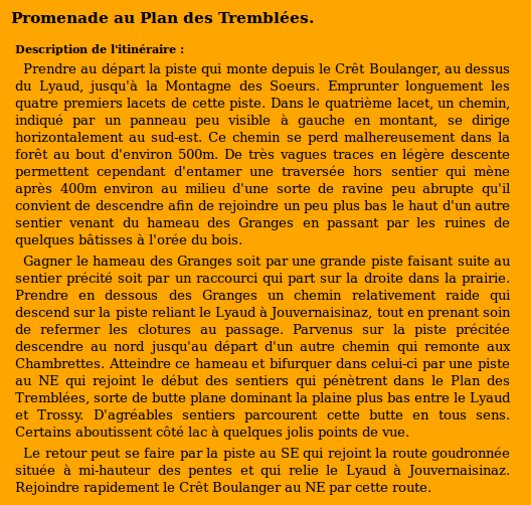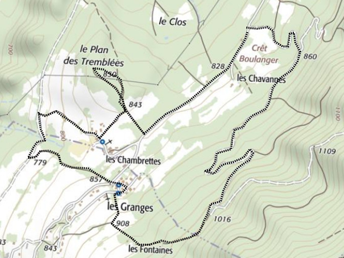 | Chalets rencontrés : Aucun. | Lieux-dits traversés: Le Crêt Boulanger, Les Fontaines, Les Granges, Les Chambrettes, Plan des Tremblées. |