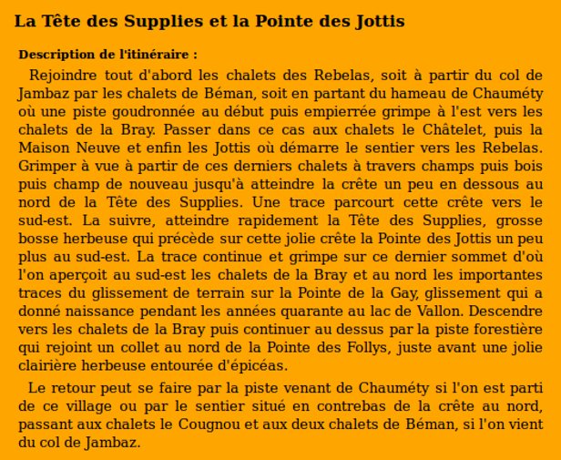 | Sommet(s) franchi(s) : Pointe des Jottis, Tête des Supplies. | Col(s) franchi(s) : Aucun. |