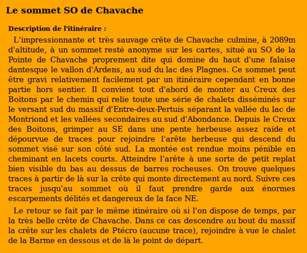 | Sommet(s) franchi(s) : Sommet SO de Chavache. | Col(s) franchi(s) : Aucun. |