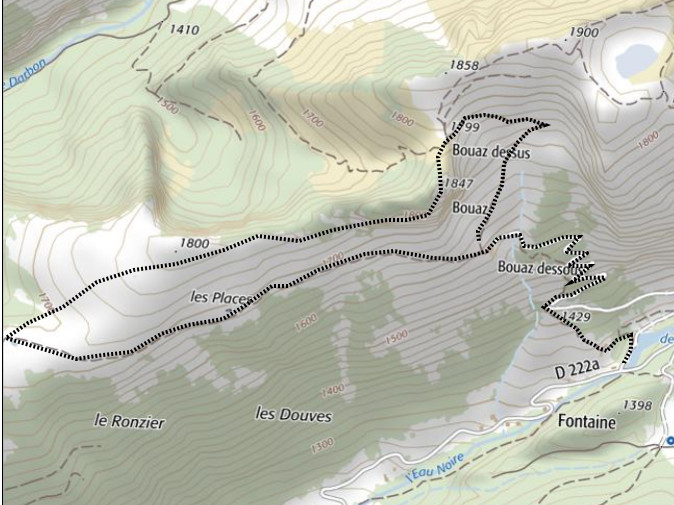 | Chalets rencontrés : Le Bouaz, Chalet le Bouaz d'en Haut. | Lieux-dits traversés: Lac de Fontaine. |