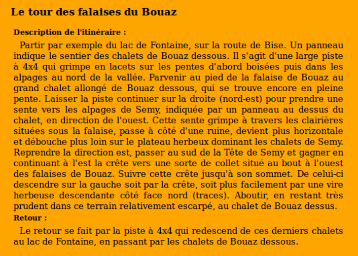 | Sommet(s) franchi(s) : Falaises du Bouaz. | Col(s) franchi(s) : Aucun. |