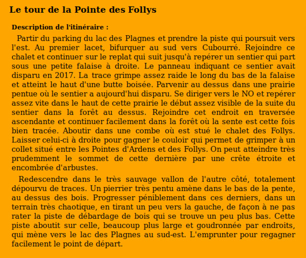 | Sommet(s) franchi(s) : Pointe des Follys. | Col(s) franchi(s) : Aucun. |