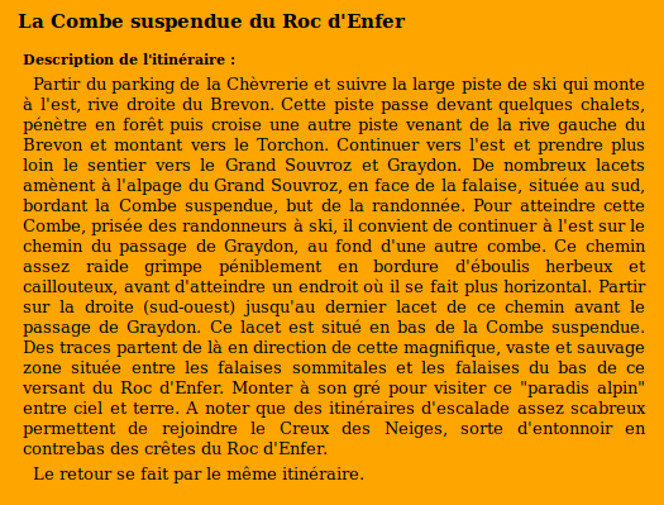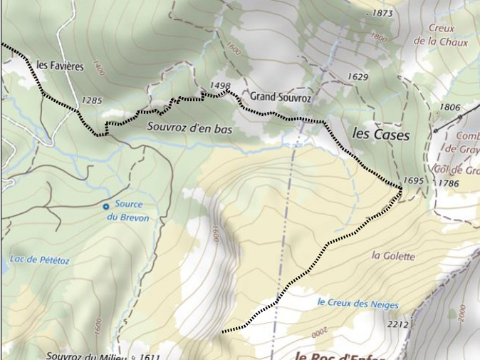 | Chalets rencontrés : Les Favières, Le Finge, Le Grand Souvroz. | Lieux-dits traversés: La Chèvrerie. |