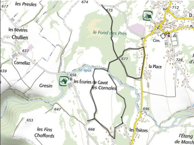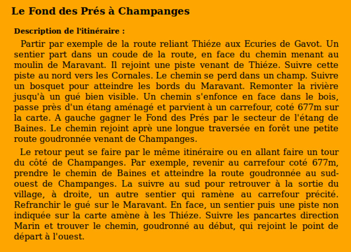 | Chalets rencontrés : Aucun. | Lieux-dits traversés: Champanges, Thièze, Le Fond des Prés, Etang de Baines, Les Cornales. |