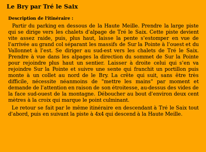 | Sommet(s) franchi(s) : Le Bry. | Col(s) franchi(s) : Aucun. |