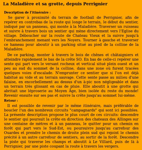 | Photo de l'itinéraire Carte de l'itinéraire | Description de l'itinéraire |