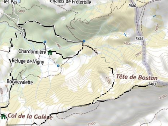 | Chalets rencontrés : Chalet de Bonnevalette, Chalet de Chardonnière, Refuge de la Golèse, Chalet de Vigny. | Lieux-dits traversés: Crête de l'Avouille. |